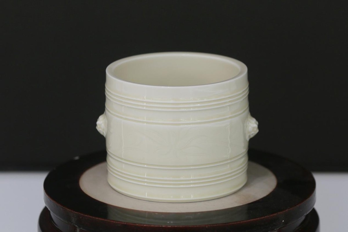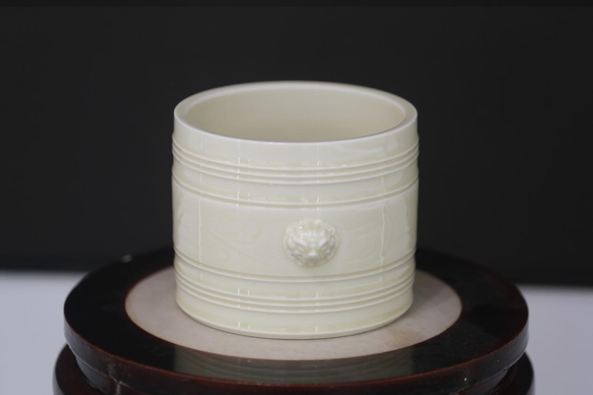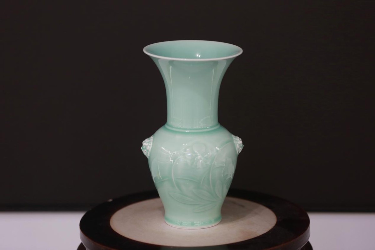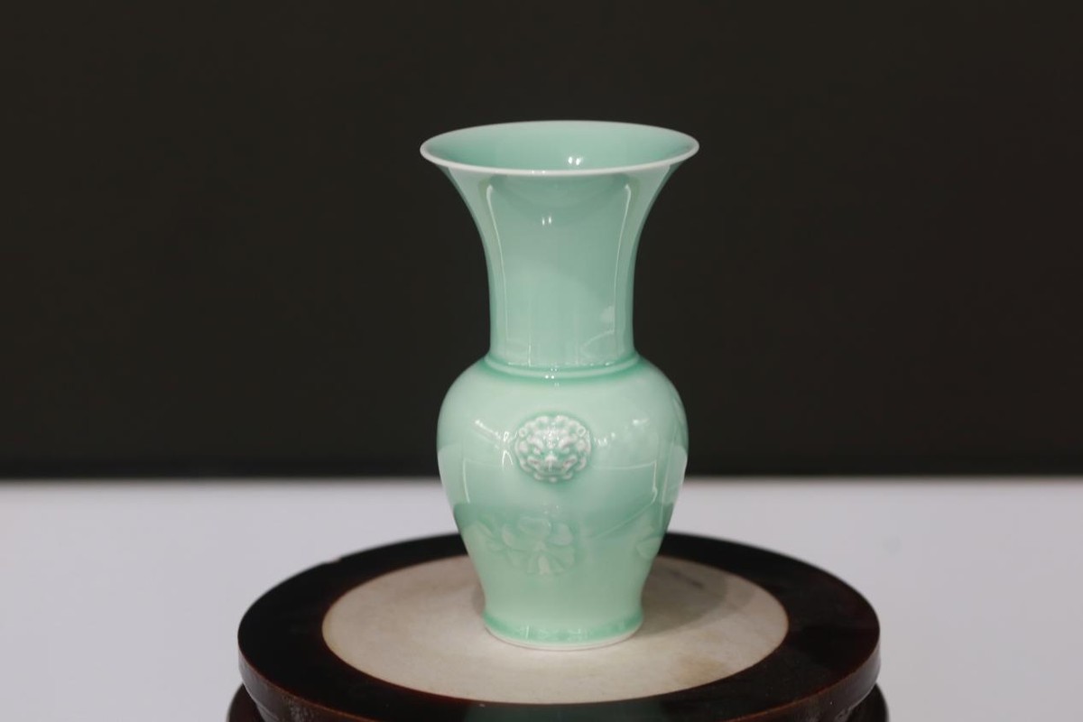 “三弦纹笔筒式花器”则采用三弦纹笔筒造型,中心饰以卢沟桥石狮头颅轮廓,象征沉淀了十四年抗战的刚毅与牺牲精神;施以影青湖蓝釉色,用弦纹与年轮元素喻指时光流逝与历史的镌刻,整体恢弘大气,表达“以史为鉴、开创未来”的坚定信念,寓意今日中国以强大的力量沉稳地守护来之不易的和平,并以国家崛起和发展的成就告慰先烈。