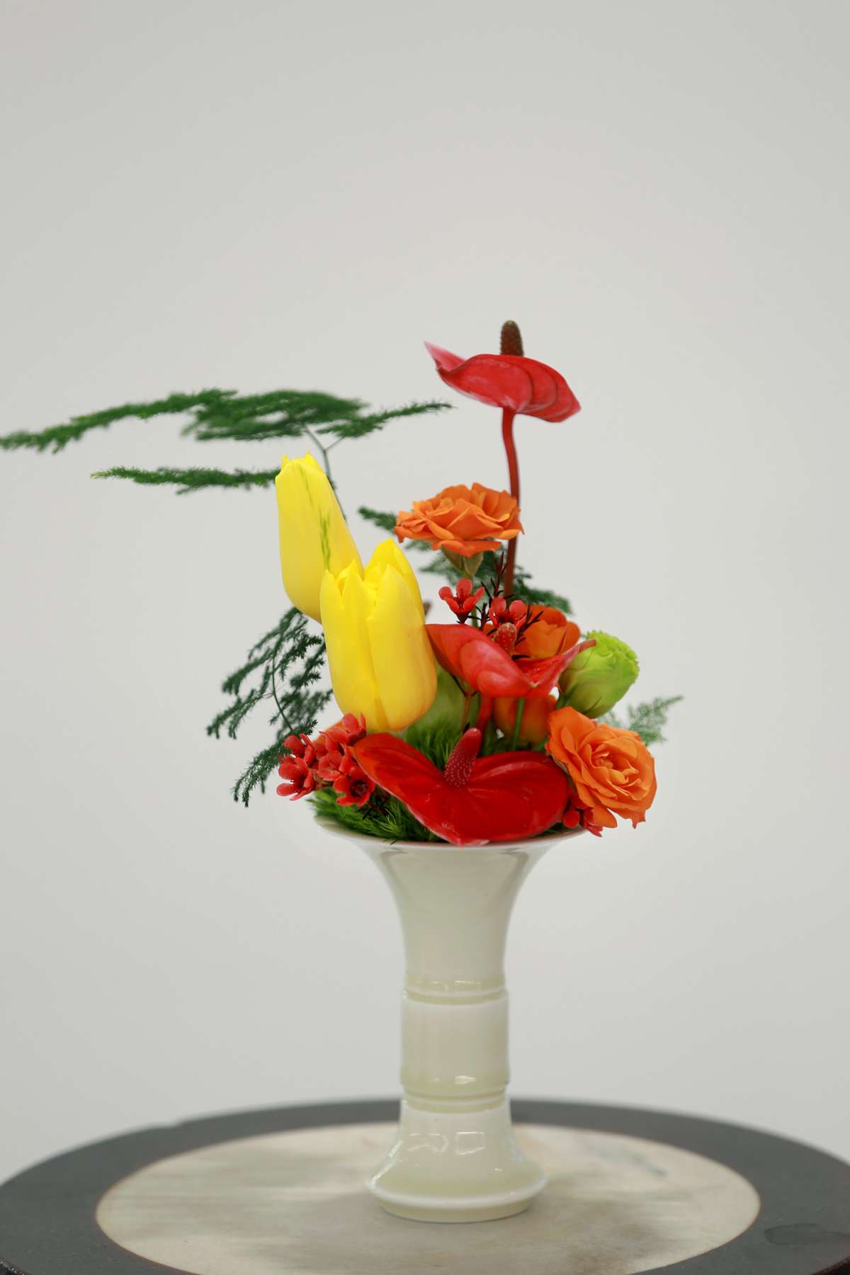 其中“蝴蝶兰与石狮花器”以舒展的蝴蝶兰装饰,与丰台区卢沟桥石狮的雄姿相呼应,寓意沉睡的雄狮已然觉醒,今日国家的繁荣与绽放是对历史上那段艰难岁月最深刻、最温柔的回应与告慰。